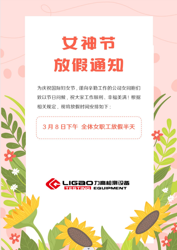 人間三月芳菲始,又是一年花開時(shí),值此“三八”婦女節(jié)來(lái)臨之際,謹(jǐn)向力高檢測(cè)設(shè)備有限公司各位女同事致以衷心的節(jié)日問(wèn)候!每位女神都是鏗鏘玫瑰,盡顯芳華,在此,祝各位女神們節(jié)日快樂(lè),芳華自在,笑靨如花。