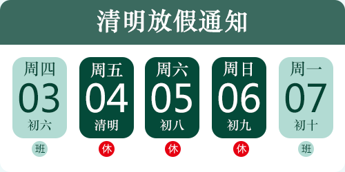 隨著清明節的腳步逐漸臨近,為了讓大家能夠更好地緬懷先人、與家人共度美好時光,公司決定按照國家法定假日安排,結合我們的實際情況,進行如下放假安排