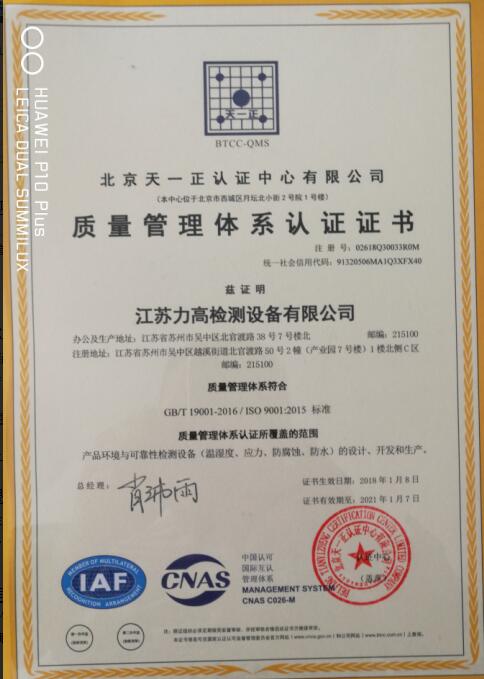 江蘇力高檢測設備憑借一貫的高標準、嚴要求、規范化生產管理及在生產實踐中結合國內外先進生產經驗所建立起來的完整、規范的生產體系,確保了企業生產的每一件產品都是高質量,符合國家標準。在長期的堅守中,形成產品生產質量規范化,順利通過了ISO9001國際質量管理體系認證。