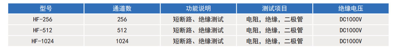 設備主要由 HF-256/512/1024 三款產品組成 ,單機測試通道覆蓋 256 通道到 1024 通道,可以快速進行電纜的短斷路,絕緣電阻等測試,移動便攜的特點非常適合線纜線束的設備現場搶修,維護,測試等工作,支持多機聯網測試模式,通過聯機電纜多臺測試儀可以協同工作,滿足現場分布式電纜測試需求。